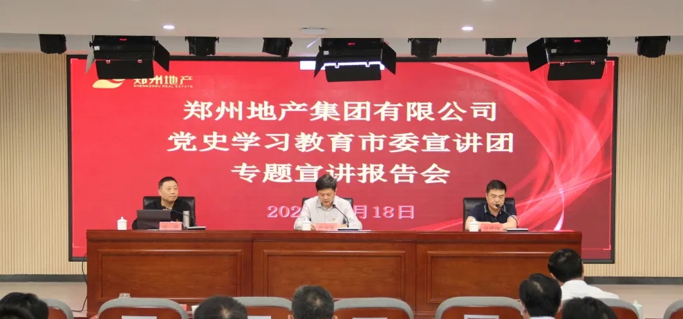 為持續(xù)推進黨史學習教育走深走實,5月18日上午,鄭州市委宣講團走進鄭州地產(chǎn)集團,在集團301多功能廳開展黨史學習教育專題宣講報告會。報告會由鄭州市委宣講團成員、鄭州工程技術(shù)學院馬克思主義學院副教授張豪主講,市國資黨史學習教育第二巡回指導組組長、四級調(diào)研員段德強,指導組成員張詩雨、陳祥斐到會巡聽旁聽,地產(chǎn)集團領導班子、總部全體員工,各子公司支部書記、黨建部門負責人等共計150余人參加現(xiàn)場報告會,各子公司員工共計170余人通過線上直播進行觀看,會議由地產(chǎn)集團黨委書記、董事長萬永生主持。