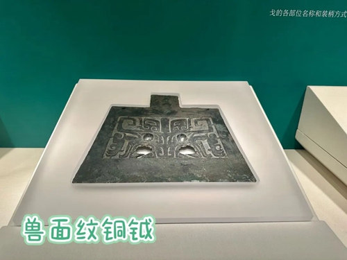 鄭州商都遺址博物院院藏的這件獸面紋銅鉞,鉞身薄而寬,兩角外移,鉞身中部鑄有一組獸面紋,雙角彎曲外聳,鏤空的大嘴上部有三角形尖齒,額部有獸紋,面部表情獰歷。