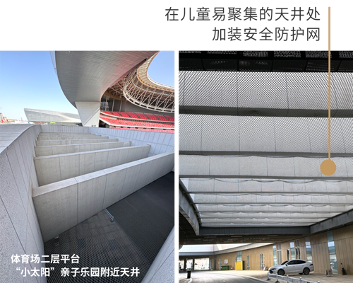 快樂成長,安全為先。為了確保兒童游樂區(qū)的安全,鄭州奧體中心從細(xì)節(jié)處著手精心加裝了多種防護裝置,在奧體中心西北角區(qū)域加裝隔離花箱、石墩,確保行人與機動車分離。同時,在體育場二層平臺兒童聚集較多的天井內(nèi),加裝防護網(wǎng);在健身器材一側(cè)加裝防護欄;在通往二層平臺的步梯兩側(cè)加裝防滑球......這些防護裝置均經(jīng)過嚴(yán)格的現(xiàn)場論證和質(zhì)量檢測,確保其具有優(yōu)異的耐用性和穩(wěn)定性。通過這些措施,鄭州奧體中心致力于為孩子們打造一個既充滿樂趣,又安全無虞的游樂環(huán)境。
