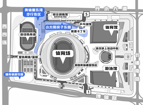 奧體童樂灣步行街區(qū)西鄰田徑訓(xùn)練場,適合開展足球、慢跑、飛盤等親子運動,南側(cè)配備有“奧體便民共享便利店”和衛(wèi)生間,向東可直達(dá)體育場二層平臺的“小太陽”網(wǎng)紅打卡地,不僅視野開闊,能一覽各場館建筑風(fēng)貌,還配備了攀爬架、沙坑、秋千等兒童玩樂項目。