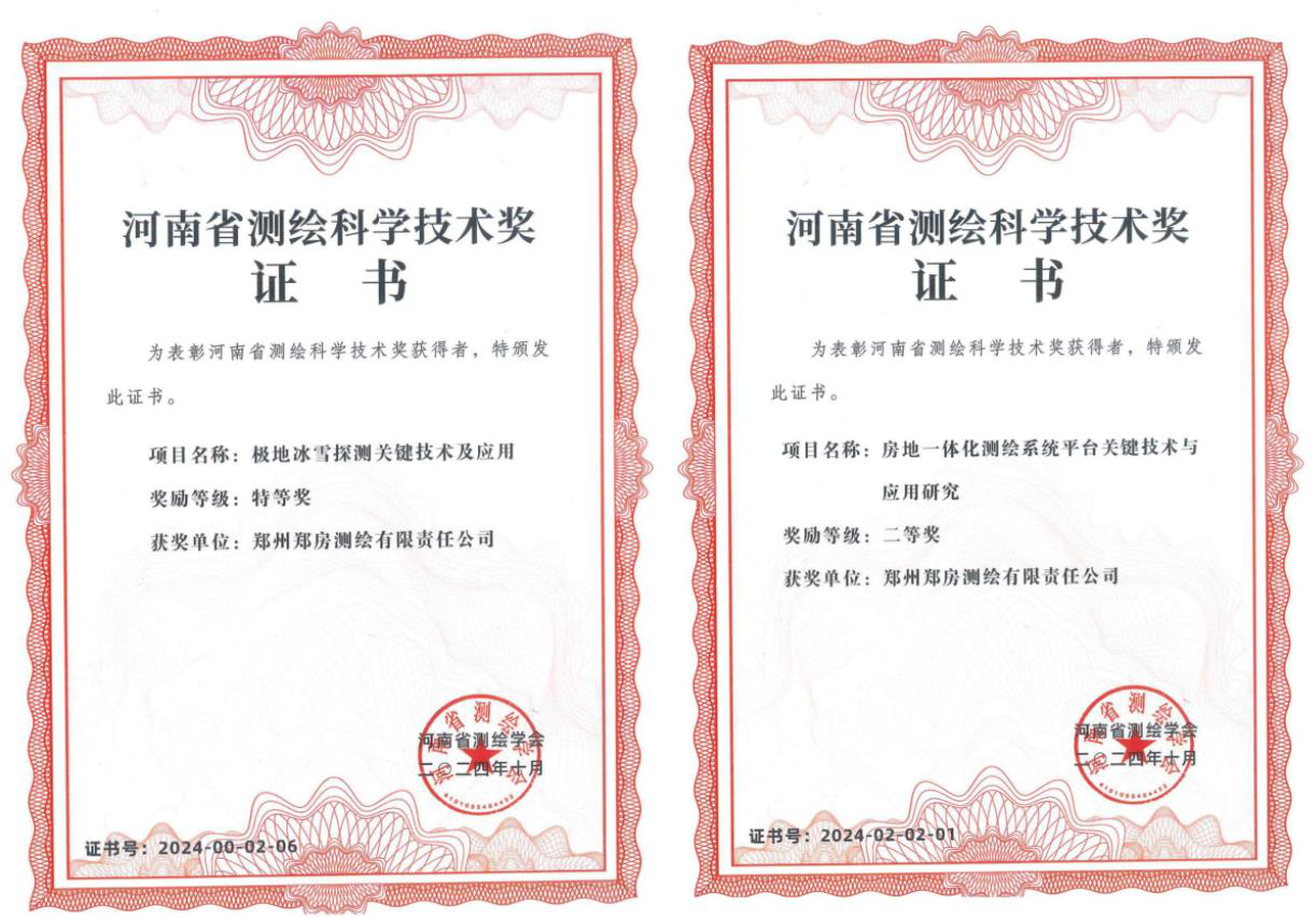 ?近期,鄭州鄭房測繪有限責任公司在科研領域取得重大突破,與相關單位聯(lián)合研發(fā)的《極地冰雪探測關鍵技術及應用》和《房地一體化測繪系統(tǒng)平臺關鍵技術與應用研究》兩個項目分別榮獲河南省測繪學會頒發(fā)的科學技術成果特等獎和二等獎,為公司科技創(chuàng)新工作再添濃墨重彩的一筆。
