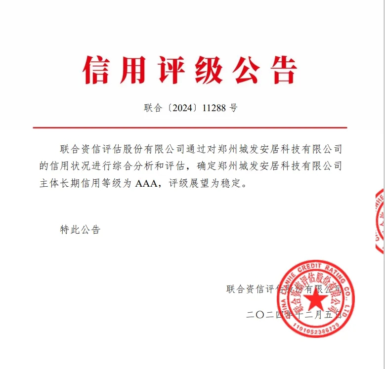 12月5日,鄭州城市發(fā)展集團(tuán)有限公司下屬子公司鄭州城發(fā)安居科技有限公司(以下簡(jiǎn)稱(chēng)安居科技)順利取得AAA主體信用評(píng)級(jí),評(píng)級(jí)展望為“穩(wěn)定”,成功邁入國(guó)內(nèi)企業(yè)信用等級(jí)第一梯隊(duì)。