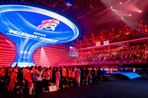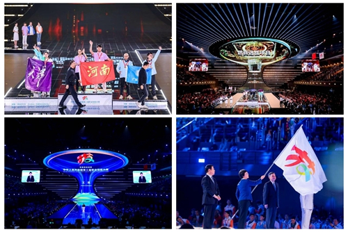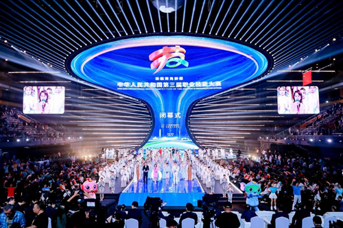 華燈璀璨,掌聲如潮。9月23日晚,當(dāng)348名獲獎(jiǎng)選手高舉隊(duì)旗與獎(jiǎng)?wù)?,?dāng)大賽會(huì)旗在璀璨的舞臺(tái)上完成交接傳遞,當(dāng)良渚文化和人形機(jī)器人在現(xiàn)場(chǎng)8000余名觀眾的歡呼聲中共舞……中華人民共和國第三屆職業(yè)技能大賽閉幕式在鄭州奧體中心體育館完美落幕!