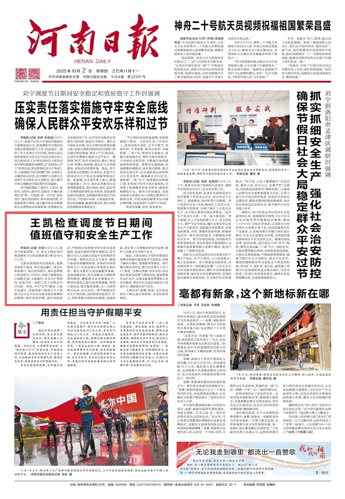 10月1日,國慶中秋假期第一天,省長王凱在鄭州檢查調(diào)度節(jié)日期間值班值守和安全生產(chǎn)工作。