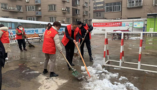 昨晚,鄭州市迎來(lái)了牛年第一場(chǎng)雪,小區(qū)活動(dòng)場(chǎng)地已披上一層皚皚白雪,為方便小區(qū)居民通行,志愿者們拿著鐵鍬、掃把清理廣場(chǎng)上的積雪,經(jīng)過大家的努力,積雪被清理干凈。