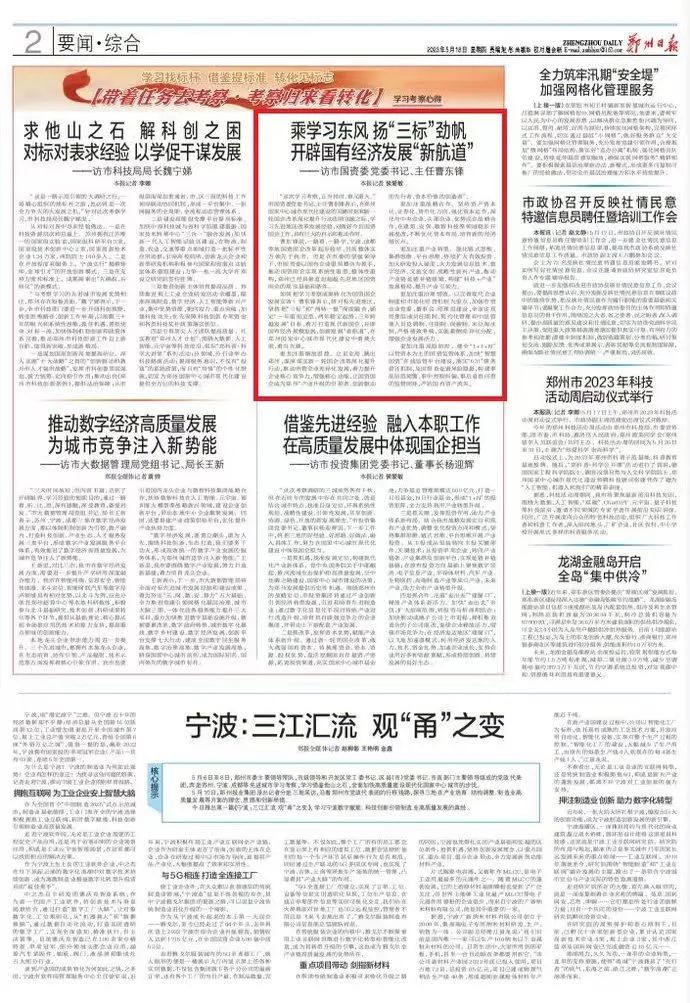 5月18日,《鄭州日報》刊發(fā)市國資委黨委書記、主任曹東鋒專訪文章《乘學(xué)習(xí)東風(fēng) 揚“三標”勁帆 開辟國有經(jīng)濟發(fā)展“新航道”》,為您全文分享如下——